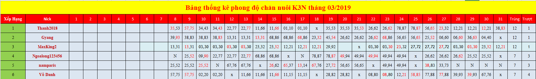BẢNG THỐNG KÊ CHĂN NUÔI HẾT THÁNG 3/2019 K3N
